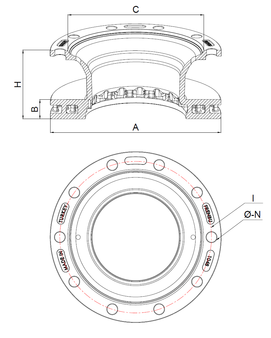 | BALATA ÇAPI | BALATA BOYU | KOMPLE BOY | GÖBEK ÇAPI | DELİK MERKEZİ | DELİK SAYISI | DELİK ÇAPI |