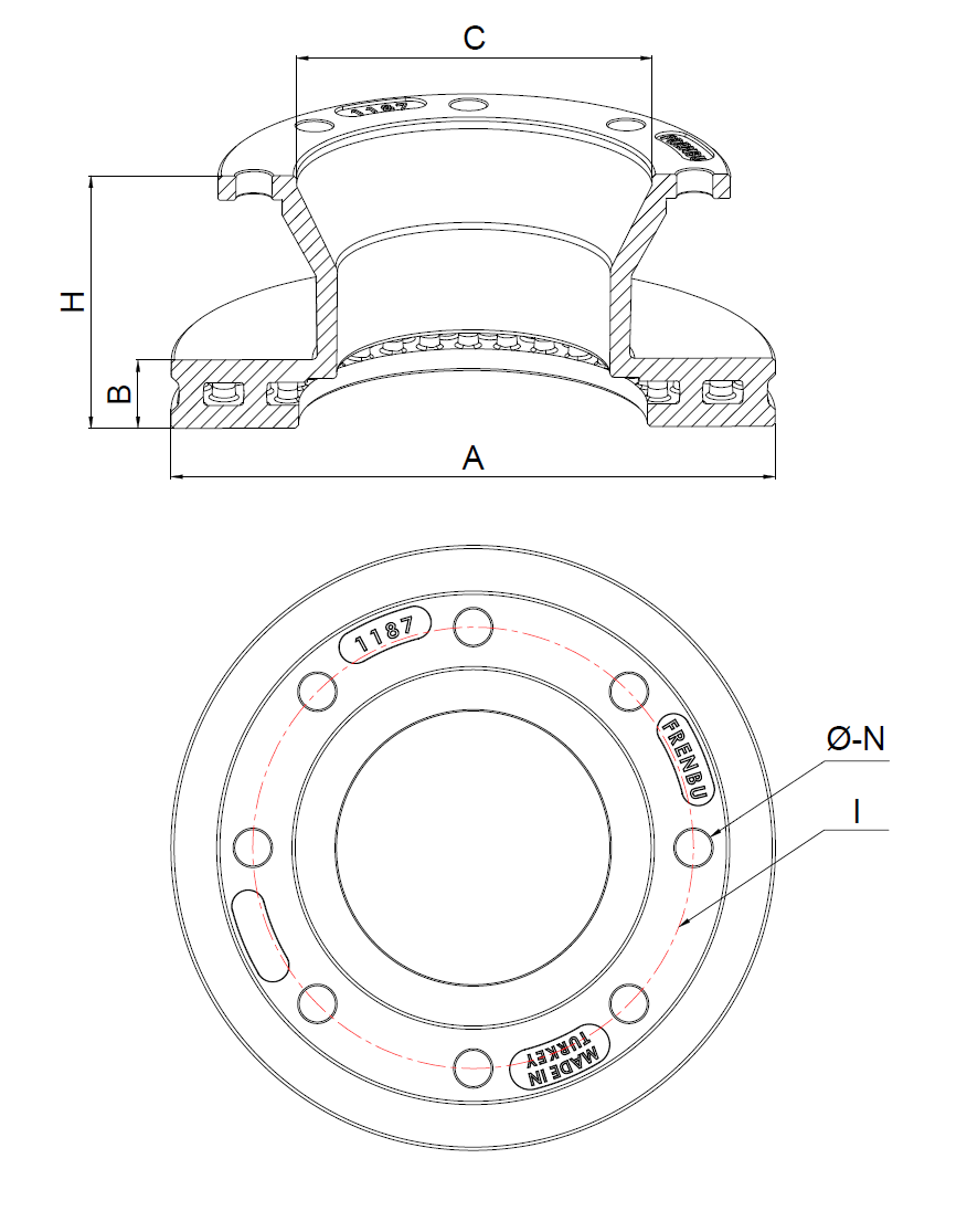 | BALATA ÇAPI | BALATA BOYU | KOMPLE BOY | GÖBEK ÇAPI | DELİK MERKEZİ | DELİK SAYISI | DELİK ÇAPI |