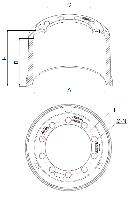 | BALATA ÇAPI | BALATA BOYU | KOMPLE BOY | GÖBEK ÇAPI | DELİK MERKEZİ | DELİK SAYISI | DELİK ÇAPI |