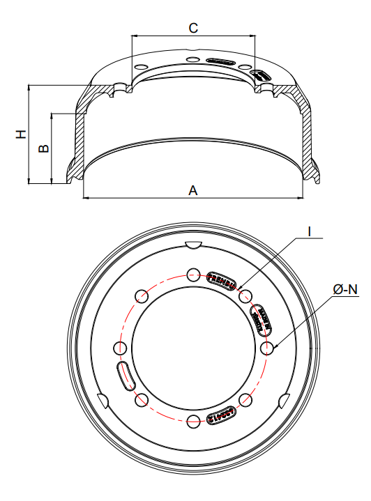 | BALATA ÇAPI | BALATA BOYU | KOMPLE BOY | GÖBEK ÇAPI | DELİK MERKEZİ | DELİK SAYISI | DELİK ÇAPI |