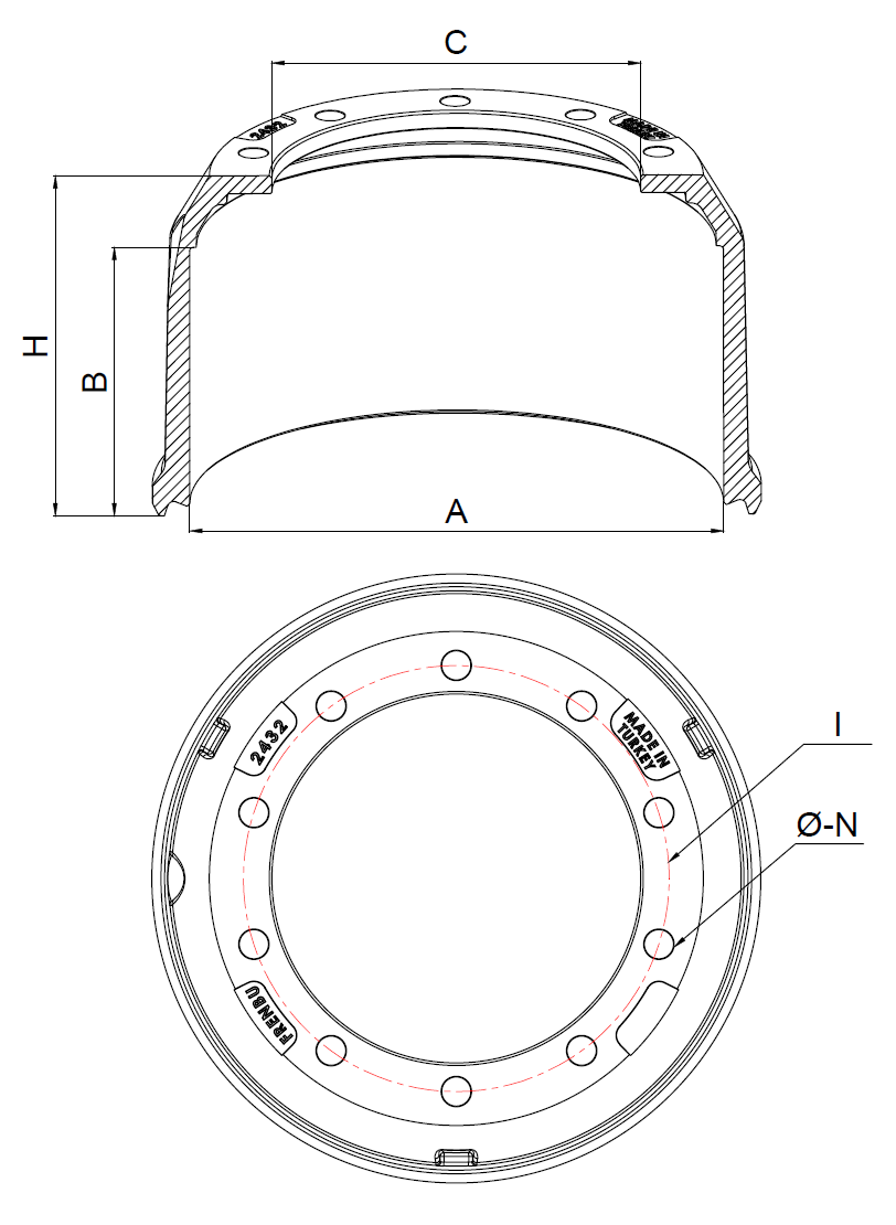 | BALATA ÇAPI | BALATA BOYU | KOMPLE BOY | GÖBEK ÇAPI | DELİK MERKEZİ | DELİK SAYISI | DELİK ÇAPI |