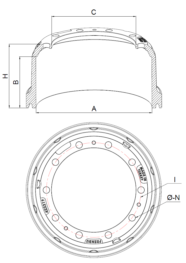 | BALATA ÇAPI | BALATA BOYU | KOMPLE BOY | GÖBEK ÇAPI | DELİK MERKEZİ | DELİK SAYISI | DELİK ÇAPI |