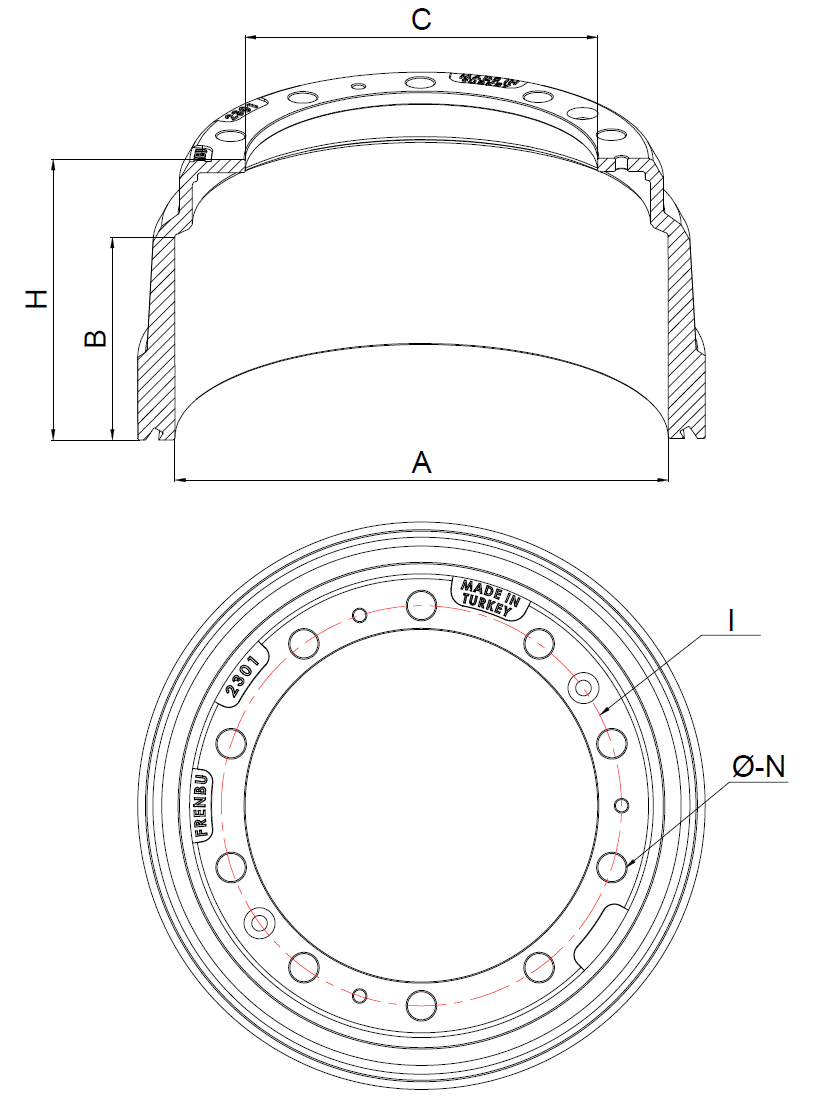 | BALATA ÇAPI | BALATA BOYU | KOMPLE BOY | GÖBEK ÇAPI | DELİK MERKEZİ | DELİK SAYISI | DELİK ÇAPI |