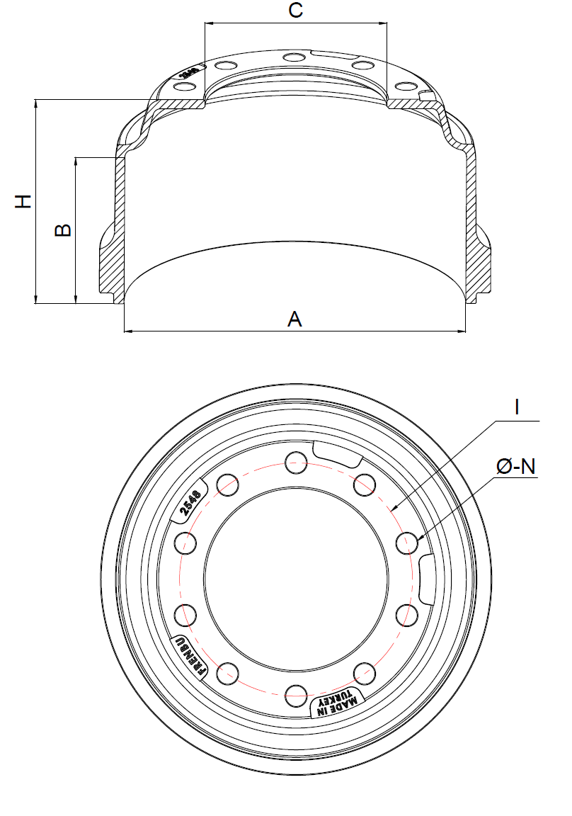 DIŞ İŞLEMELİ STANDART FREN KAMPANASI, DÖKME DEMİR, DIŞTAN TAKMA 16.50x7.00 STANDARD BRAKE DRUM WITH EXTERNAL PROCESSING, CAST IRON, OUTBOARD 16.50x7.00