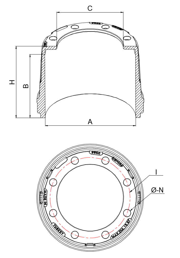 | BALATA ÇAPI | BALATA BOYU | KOMPLE BOY | GÖBEK ÇAPI | DELİK MERKEZİ | DELİK SAYISI | DELİK ÇAPI |