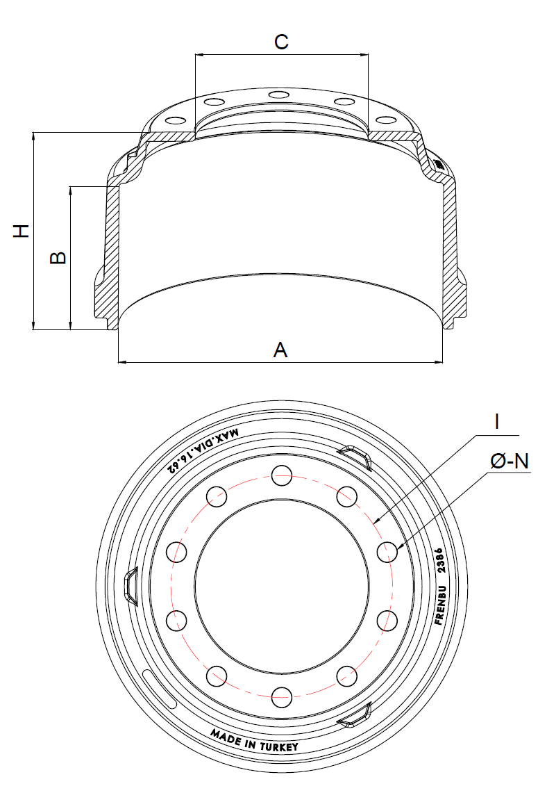 | BALATA ÇAPI | BALATA BOYU | KOMPLE BOY | GÖBEK ÇAPI | DELİK MERKEZİ | DELİK SAYISI | DELİK ÇAPI |