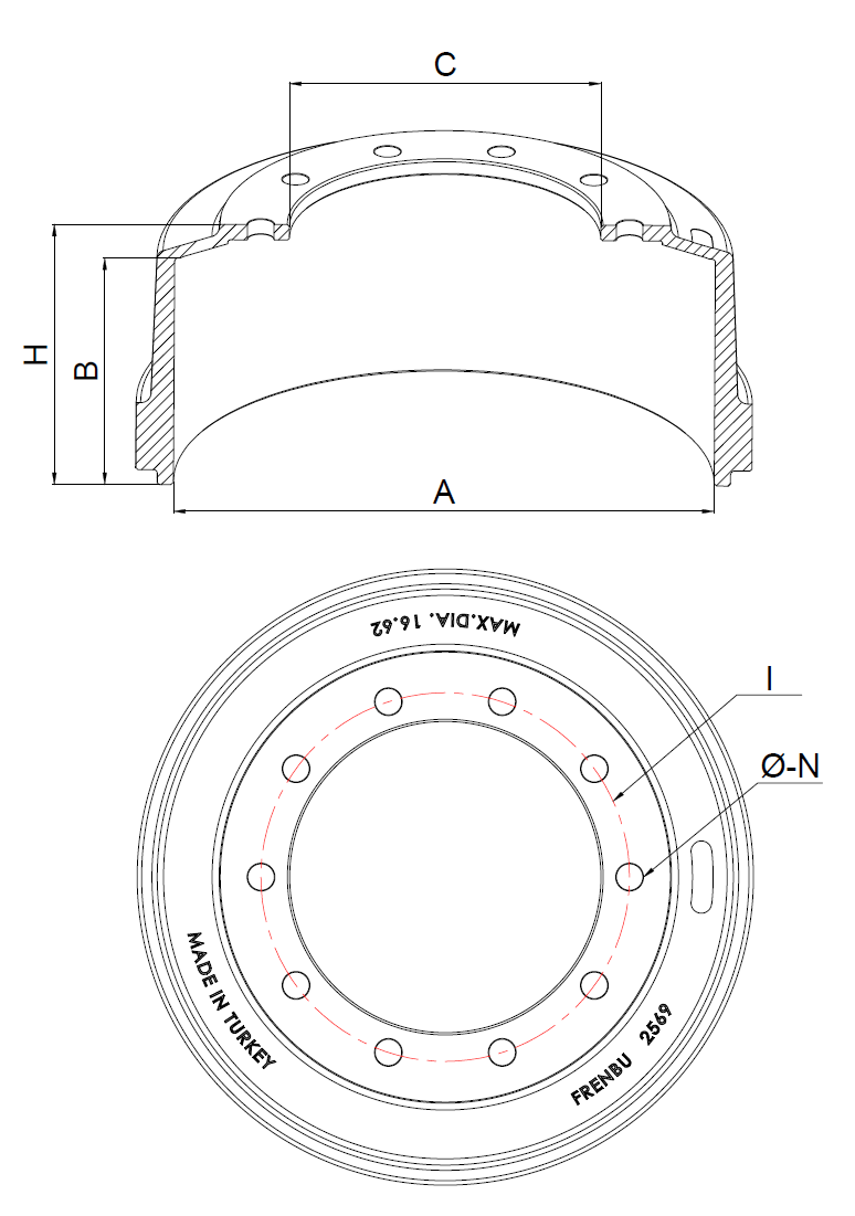 | BALATA ÇAPI | BALATA BOYU | KOMPLE BOY | GÖBEK ÇAPI | DELİK MERKEZİ | DELİK SAYISI | DELİK ÇAPI |